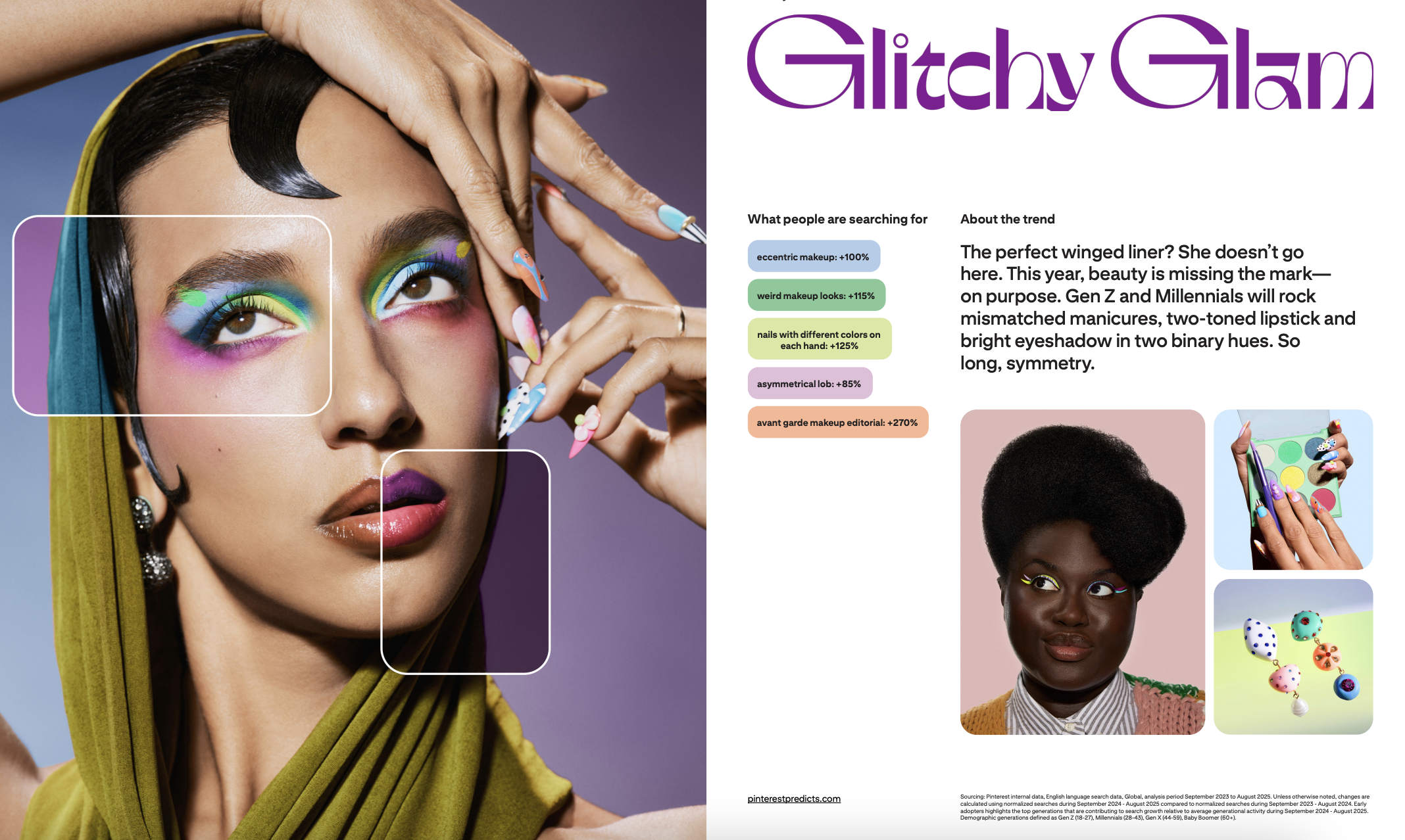According to Pinterest’s 2026 Predictions, users are searching for eccentric makeup, “weird” makeup looks, and asymmetrical styles. They're deliberately choosing imperfection—mismatched manicures and two-toned lipstick in binary hues signal a rejection of the perfectly curated aesthetic. If people are intentionally breaking symmetry in their personal style, they're equally ready for content that breaks the polished performance mold.
